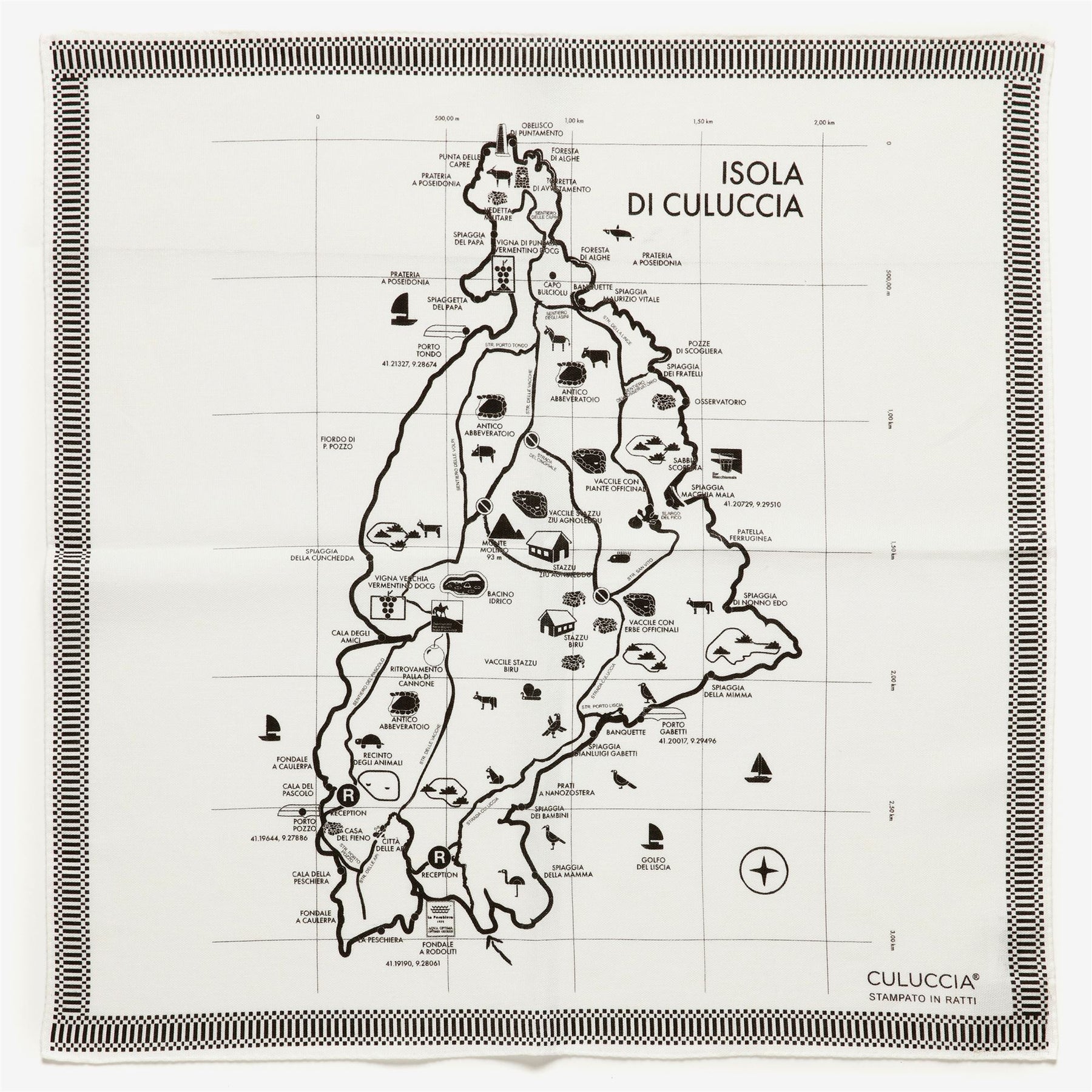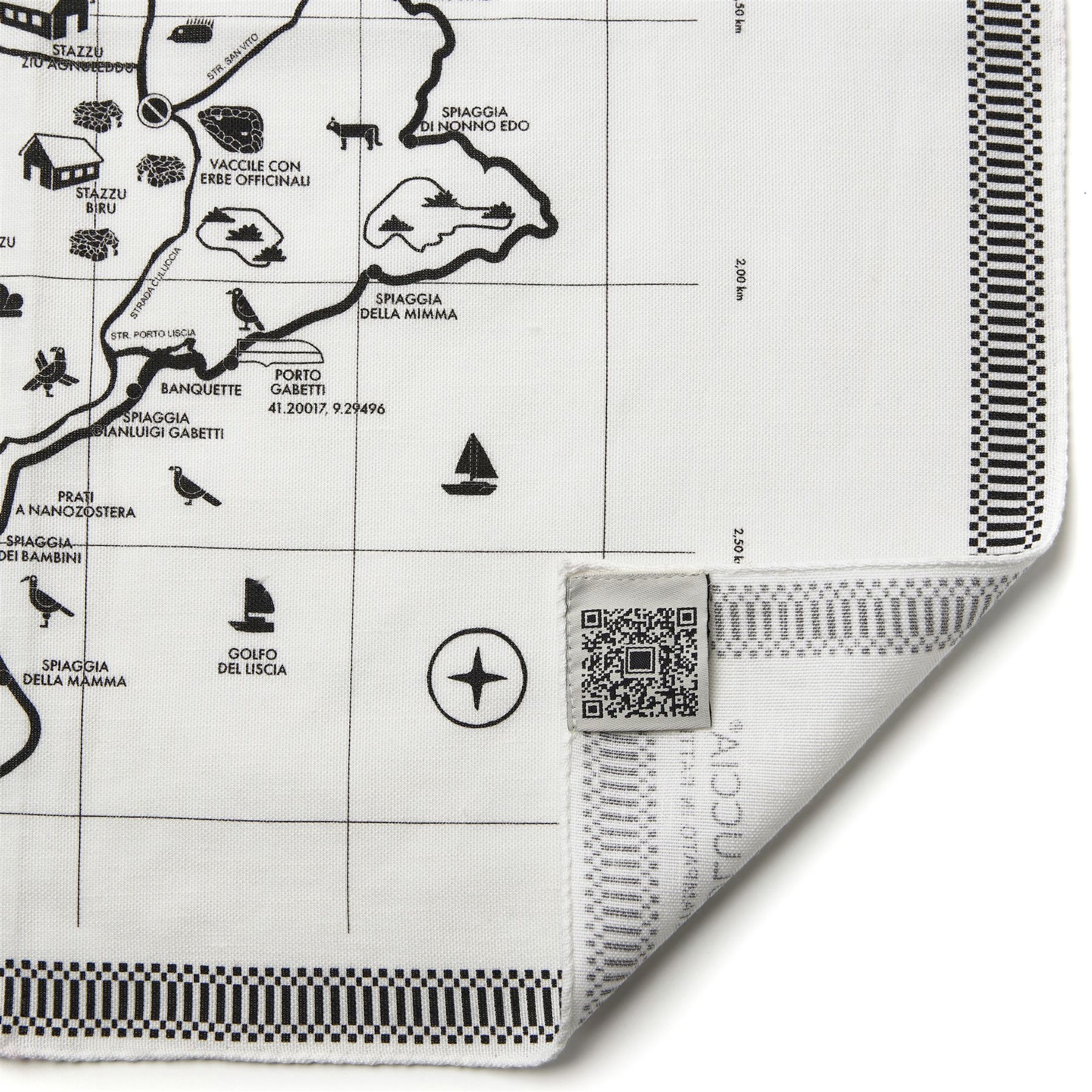 The neck scarf is designed to protect against sun and wind. This accessory is made from Panno Pranu, a cotton-linen fabric. The special feature is the silk-screen printing that reproduces the map of the island of Culuccia®. It measures 50cm x 50cm. Internally customized with a QR label crafted on a jacquard loom, allowing for deeper exploration of the project and the garment's identity.