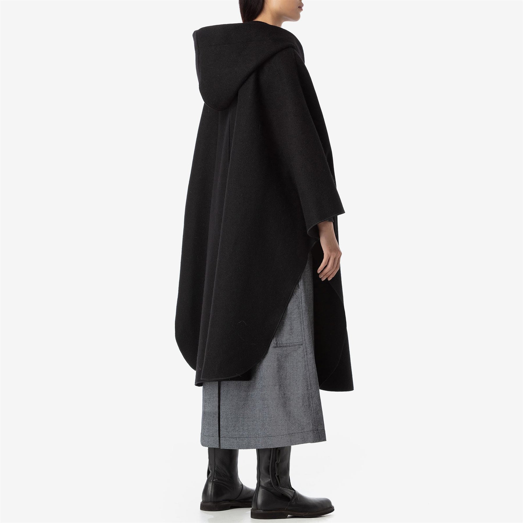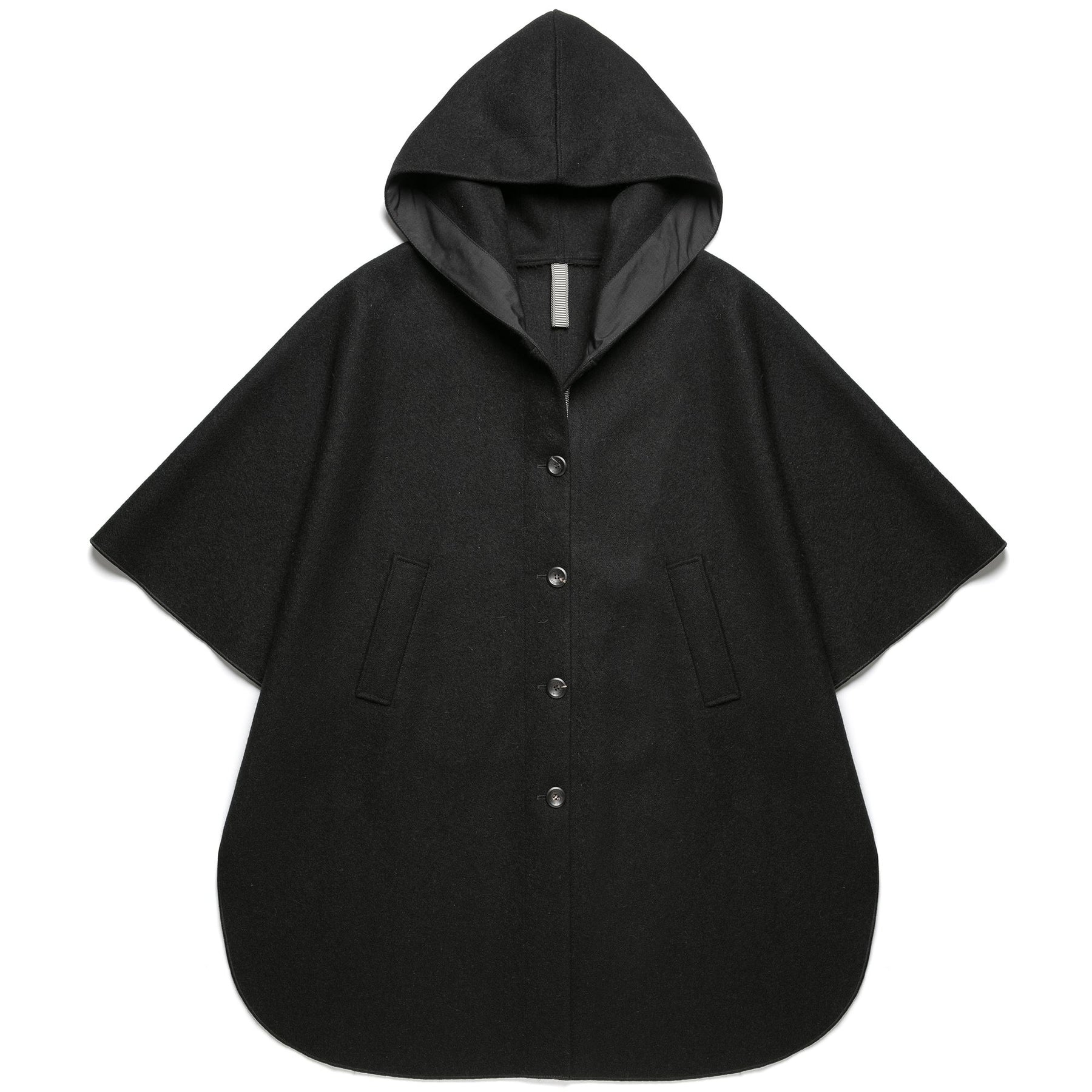 The Culuccia® cape is inspired by the traditional Sardinian cloak "Su saccu." This rough accessory garment, made by sewing together two large mirror-image pieces of orbace, served primarily practical purposes. It provided protection for the rider during travels, acted as a blanket during bivouacs, a tablecloth for shepherds' and travelers' countryside meals, or was folded to soften the rigid and angular Sardinian saddle. Culuccia®'s feminine version is made with four shaped panels sewn together in Sardinian wool cloth, resistant to wind and humidity, with natural water repellency. The fixed hood is lined internally with Cordura nylon, as is the front closure, which features the Matthoneddus tape with five large personalized horn buttons. The cape includes two large side pockets lined with brushed cotton handwarmer fabric, and two external buttons to close the flaps, forming wide sleeves. The inner hanger loop is characterized by the iconic Matthoneddus graphic motif, typical of the traditional Sardinian saddlebag (Sa Bèrtula). The garment is personalized internally with a QR label woven on a jacquard loom, offering deeper insight into the project and the identity of the piece.