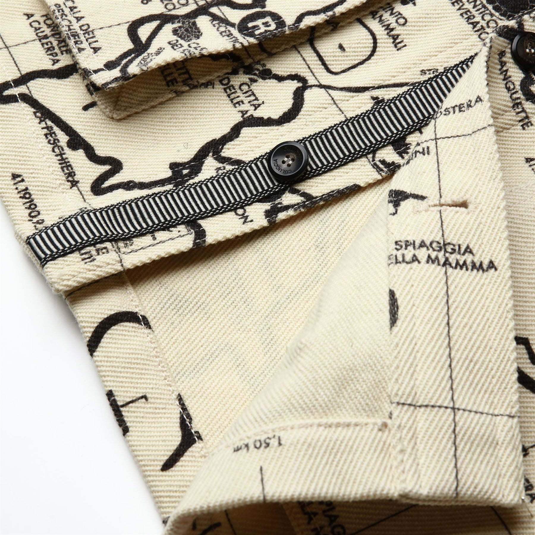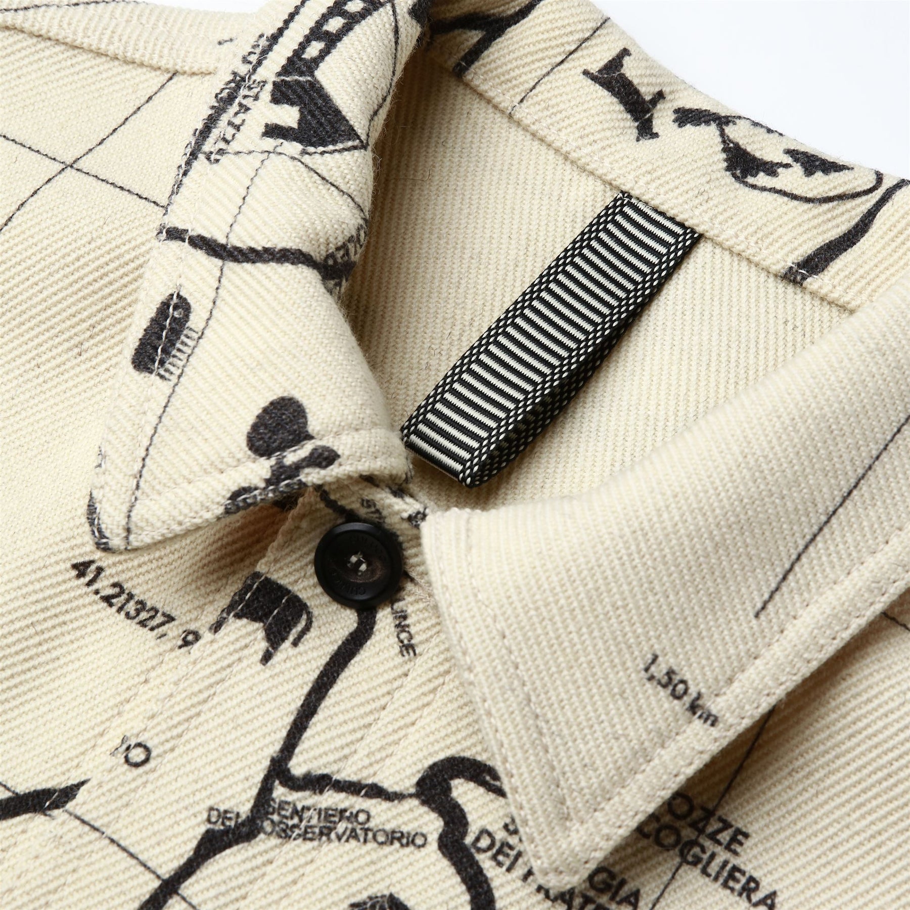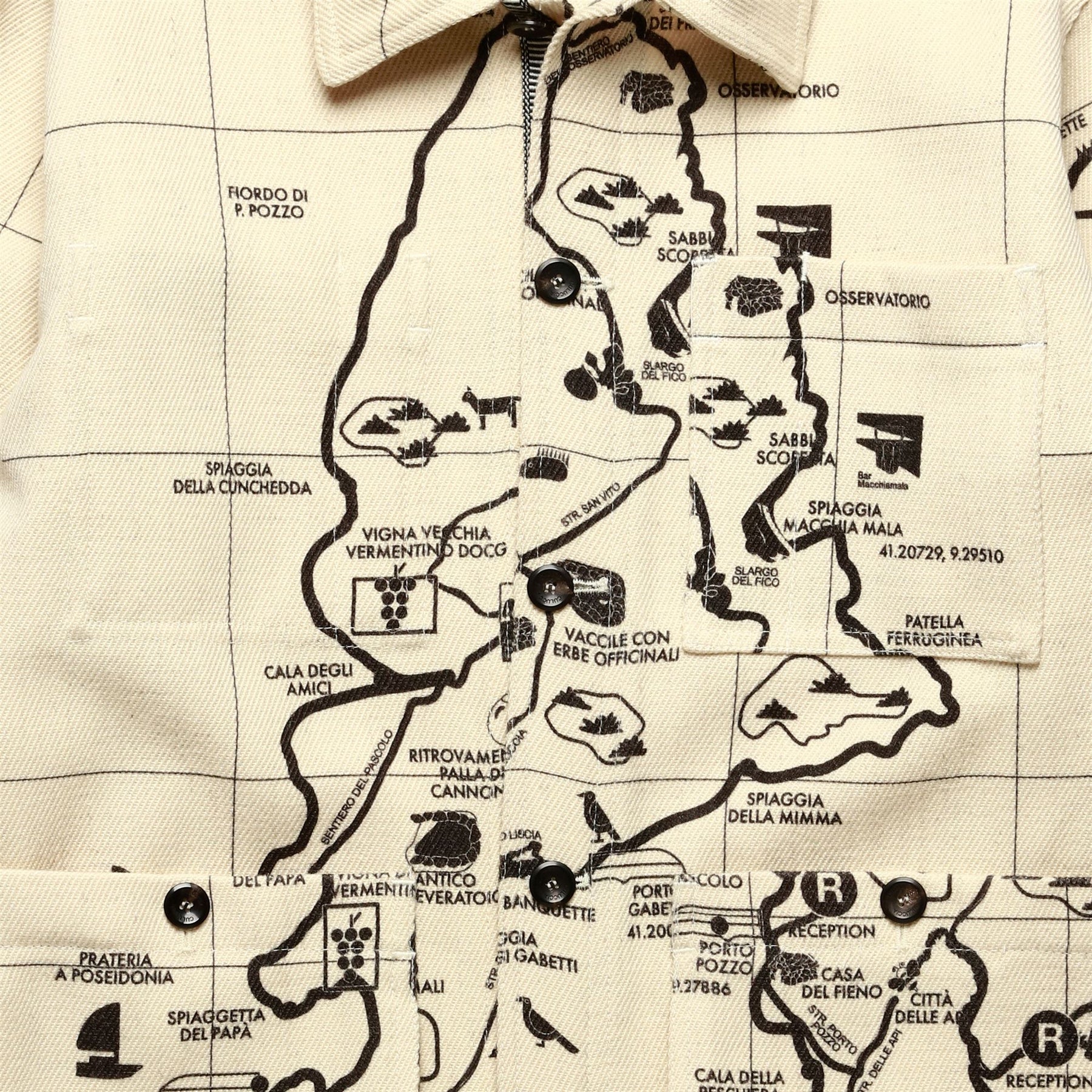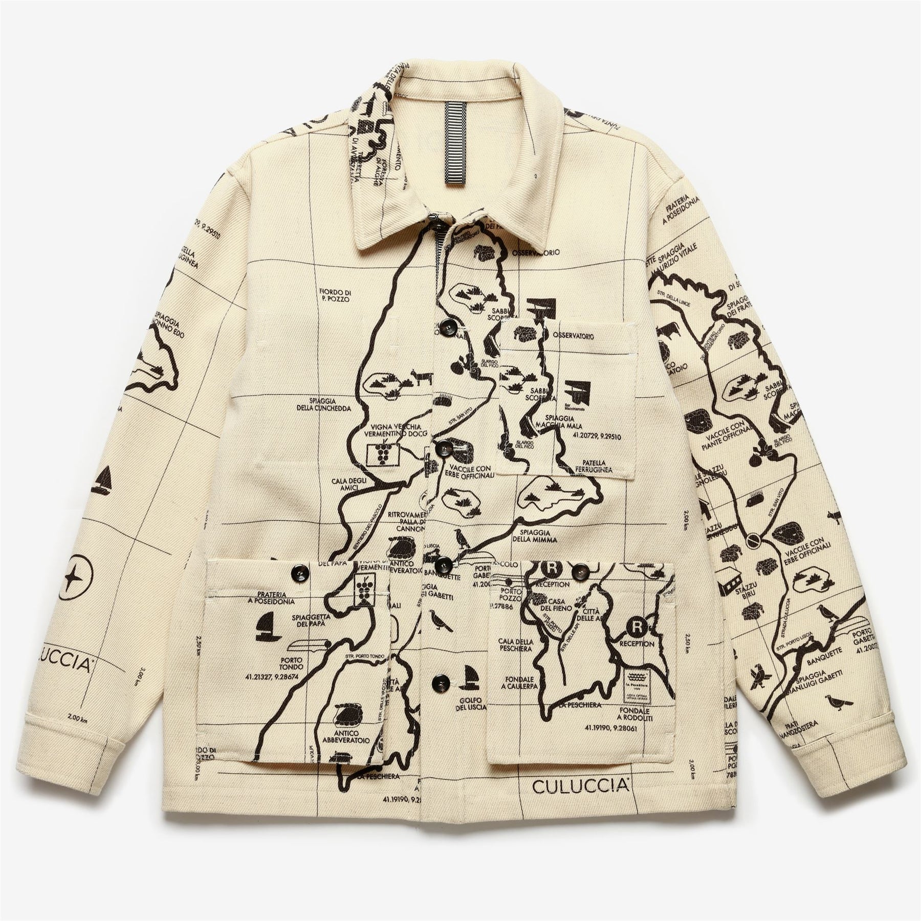A classic piece inspired by workwear. The jacket is made from printed Sardinian wool cloth, treated to offer excellent resistance to cold and humidity, along with natural water repellency. The design features a regular fit with a shirt collar, patch pockets, and adjustable cuffs with double buttons to block the wind. The front closure has personalized horn buttons. The inner hanger loop is characterized by the iconic Matthoneddus graphic motif, typical of the traditional Sardinian saddlebag (Sa Bèrtula). The interior is customized with a QR label woven on a jacquard loom, allowing deeper insight into the project and the garment's identity.